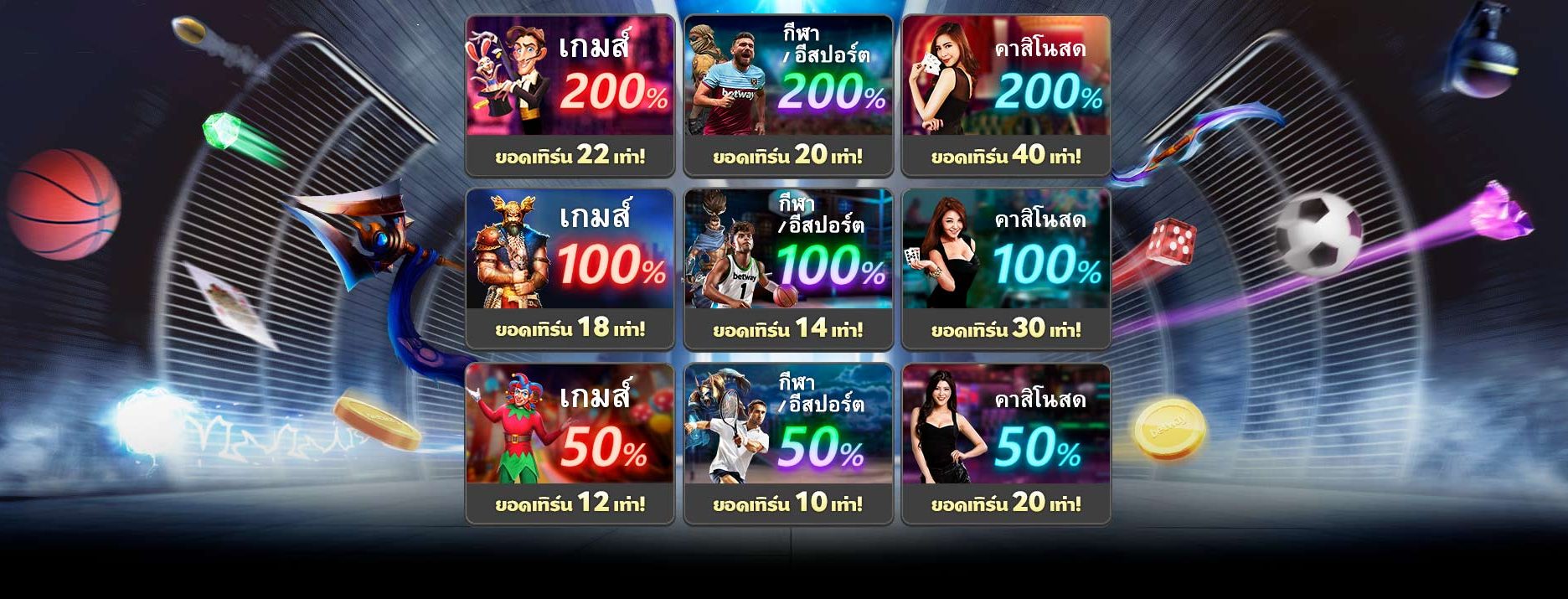 - โบนัสในการฝากเงิน เพื่อร่วมวางเดิมพันเกมกีฬา หรือวางเดิมพันคาสิโนออนไลน์ ก็มีการแยกหมวดหมู่ ให้ท่านสามารถเข้าร่วมวางเดิมพัน และรับกับสิทธิพิเศษมากมาย ที่เราพร้อมในการมอบ ให้ท่านตลอด 24 ชั่วโมง