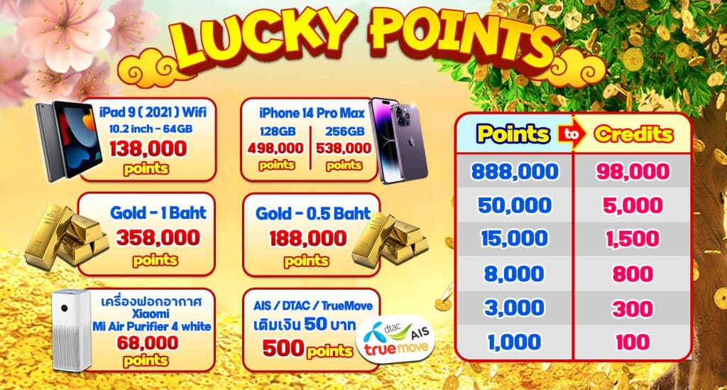 - จับฉลากLUCK DRAW ฉลากนำโชคลุ้นรับรางวัลมูลค่าสูงสุด 3388 โดยลูกค้าต้องมียอดฝากขั้นต่ำ 500 บาท และมียอดเทิร์นโอเวอร์ 3000 บาทจึงจะสามารถรับรางวัลได้