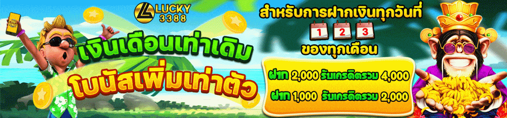 - เงินเดือนเท่าเดิม โบนัสเพิ่มเท่าตัว สำหรับการฝากเงินทุกวันที่ 1 2 3 ฝาก 1000 รับโบนัส 1000 ฝาก 2000 รับโบนัส 2000