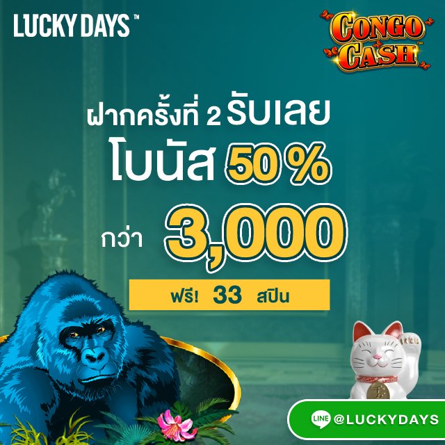 - โบนัส 100% สูงสุดถึง 3,000 บาท และฟรีสปิน 33 ครั้ง